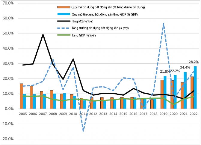 Dữ liệu về tài chính bất động sản trung hạn được mô tả khái quát tại Đồ thị 1 cho thấy, tỉ trọng dư nợ bất động sản bắt đầu suy giảm từ cuối năm 2008 đến năm 2011. Sau đó quy mô tín dụng bất động sản và tỉ trọng tương đối ổn định trong giai đoạn từ năm 2012 đến cuối năm 2018. Điều này phù hợp với quan điểm điều hành CSTT thắt chặt và chủ trương nắn dòng tín dụng vào khu vực sản xuất theo Nghị quyết số 11/NQ-CP ngày 24/02/2011 của Chính phủ về những giải pháp chủ yếu tập trung kiềm chế lạm phát, ổn định kinh tế vĩ mô, đảm bảo an sinh xã hội. Trong 5 năm (từ năm 2018 đến năm 2022), dữ liệu cho thấy tín dụng bất động sản tăng khá mạnh.