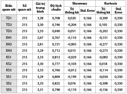 Bảng 12 cho thấy giá trị của các biến đo lường đều có hệ số đối xứng Skewness và hệ số tập trung Kurtosis phân bố trong khoảng [- 1, +1] nên có phân phối gần phân phối chuẩn, do đó, thích hợp cho việc áp dụng phân tích nhân tố khám phá và các kĩ thuật định lượng khác.