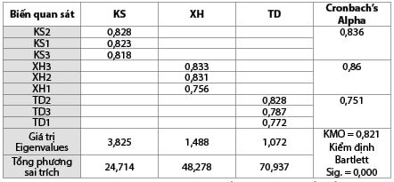 Kết quả kiểm định độ tin cậy cho thấy, các thang đo trong mô hình đều có hệ số Cronbach’s Alpha lớn hơn 0,6. Bên cạnh đó, hệ số tương quan biến - tổng của các biến quan sát trong từng thang đo đều có giá trị lớn hơn 0,3. Do đó, các thang đo đều đảm bảo độ tin cậy để tiến hành phân tích EFA.