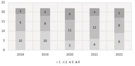 Dựa trên Hình 2, có thể thấy các NHTM trong mẫu nghiên cứu đều được xếp loại vào các nhóm từ 1 đến 3 dựa trên mức điểm tổng hợp. Như vậy, tất cả các ngân hàng trong mẫu nghiên cứu đều có chất lượng tốt, không có ngân hàng nào bị phân loại yếu kém. Số lượng các ngân hàng thuộc nhóm 1 dao động từ 3 - 6 ngân hàng trong khoảng thời gian từ năm 2018 đến năm 2022. Số ngân hàng nhóm 2 và 3 có sự biến động mạnh trong khoảng thời gian 2020 - 2021, trong đó, có đến 50% ngân hàng từ nhóm 3 đã dịch chuyển lên nhóm 2.