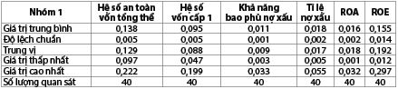 Dưới đây là một số thống kê đáng chú ý về các tiêu chí phân loại về mặt định tính theo mỗi nhóm. Nhóm 1 có hệ số an toàn vốn và hệ số vốn cấp 1 đều cao hơn các nhóm còn lại, thể hiện mức độ an toàn của các ngân hàng trong nhóm này. Trong khi đó, tỉ lệ bao phủ nợ của các nhóm dao động từ 0,011 đến 0,013 và không có sự chênh lệch lớn giữa các nhóm. Tỉ lệ nợ xấu dao động trong khoảng từ 1,8% đến 2,2%, trong đó, nhóm 3 có tỉ lệ nợ xấu là cao nhất. Về khía cạnh khả năng sinh lời, tỉ lệ ROA và ROE của nhóm 3 thấp hơn hai nhóm còn lại trong khoảng thời gian nghiên cứu. (Bảng 4, 5, 6)