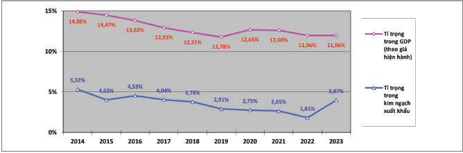 Hình 1: Đóng góp của nông nghiệp vào GDP và kim ngạch xuất khẩu giai đoạn 2014 - 2023