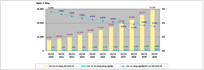 Với dư nợ tín dụng đạt được đến hết năm 2023, giả sử trong giai đoạn 2024 - 2030, hoạt động cho vay của hệ thống ngân hàng đối với nền kinh tế và ngành nông nghiệp vẫn tăng trưởng với tốc độ bình quân của giai đoạn 2014 - 2023 (lần lượt là 14,58%/năm và 10,03%/năm) thì đến cuối năm 2030, tỉ trọng dư nợ tín dụng nông nghiệp trong tổng dư nợ tín dụng đối với nền kinh tế là 5,29% và tính chung giai đoạn 2021 - 2030, tỉ trọng này là 6,23%. Số liệu về dư nợ và tỉ trọng dư nợ ước tính của ngành nông nghiệp từng năm được thể hiện tại Hình 11.