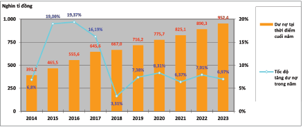 Căn cứ các chính sách tín dụng đối với lĩnh vực nông nghiệp do Chính phủ và NHNN ban hành, trong những năm qua, hệ thống ngân hàng đã liên tục đẩy mạnh hoạt động cho vay đối với các tổ chức, cá nhân để thực hiện các dự án, phương án sản xuất, kinh doanh nông nghiệp, vì thế, dư nợ tín dụng đối với ngành nông nghiệp không ngừng tăng lên mỗi năm. Thống kê cho thấy, thời điểm cuối năm 2013, dư nợ tín dụng nông nghiệp đạt 366,1 nghìn tỉ đồng; đến hết năm 2023, dư nợ tín dụng nông nghiệp tăng gấp 2,6 lần, đạt 952,4 nghìn tỉ đồng. Diễn biến dư nợ và tốc độ tăng trưởng tín dụng đối với ngành nông nghiệp từng năm giai đoạn 2014 - 2023 được thể hiện tại Hình 3.