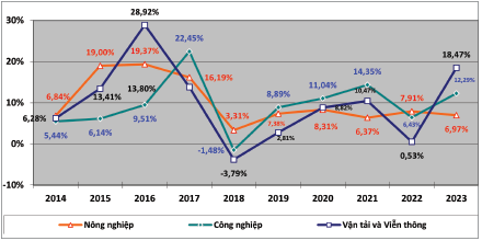 Hình 7: Tốc độ tăng trưởng tín dụng bình quân theo ngành giai đoạn 2014 - 2023