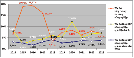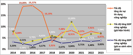 Hình 5: Tốc độ tăng trưởng tín dụng và GDP nông nghiệp giai đoạn 2014 - 2023