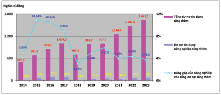 Hình 8: Đóng góp của ngành nông nghiệp vào tổng dư nợ tín dụng tăng thêm giai đoạn 2014 - 2023