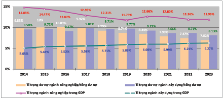 Thống kê cho thấy, trong giai đoạn 2014 - 2023, giá trị sản xuất nông nghiệp chiếm 12,73% GDP (tính theo giá hiện hành); dư nợ tín dụng bình quân đối với ngành nông nghiệp chiếm 8,56% tổng dư nợ bình quân của hệ thống ngân hàng. Ngành xây dựng đóng góp 5,84% vào GDP giai đoạn 2014 - 2023, thấp hơn 6,89 điểm phần trăm so với ngành nông nghiệp, tuy nhiên, dư nợ tín dụng bình quân của ngành xây dựng chiếm đến 9,12% tổng dư nợ tín dụng bình quân của nền kinh tế, cao hơn ngành nông nghiệp 0,56 điểm phần trăm. Mức độ đóng góp vào GDP và quy mô dư nợ tín dụng nền kinh tế của ngành nông nghiệp và ngành xây dựng trong từng năm được thể hiện tại Hình 9.