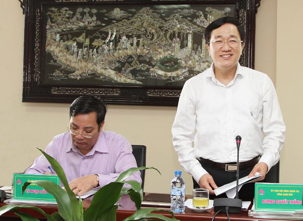 Đồng chí Dương Quyết Thắng, Ủy viên HĐQT - Tổng giám đốc báo cáo kết quả hoạt động NHCSXH trong quý I/2015