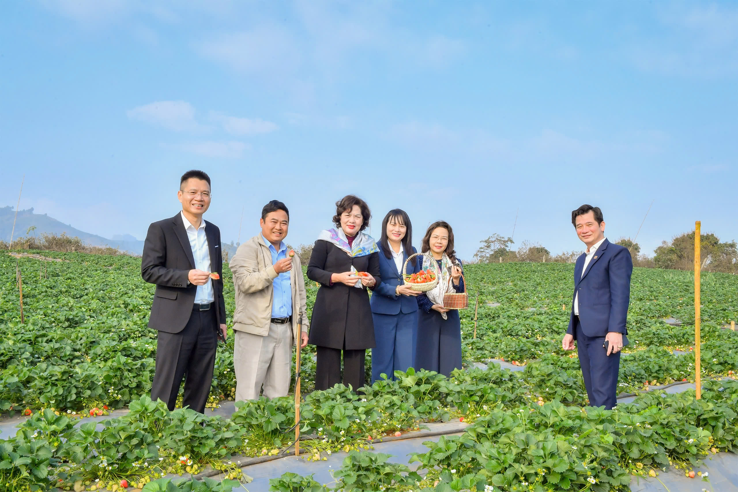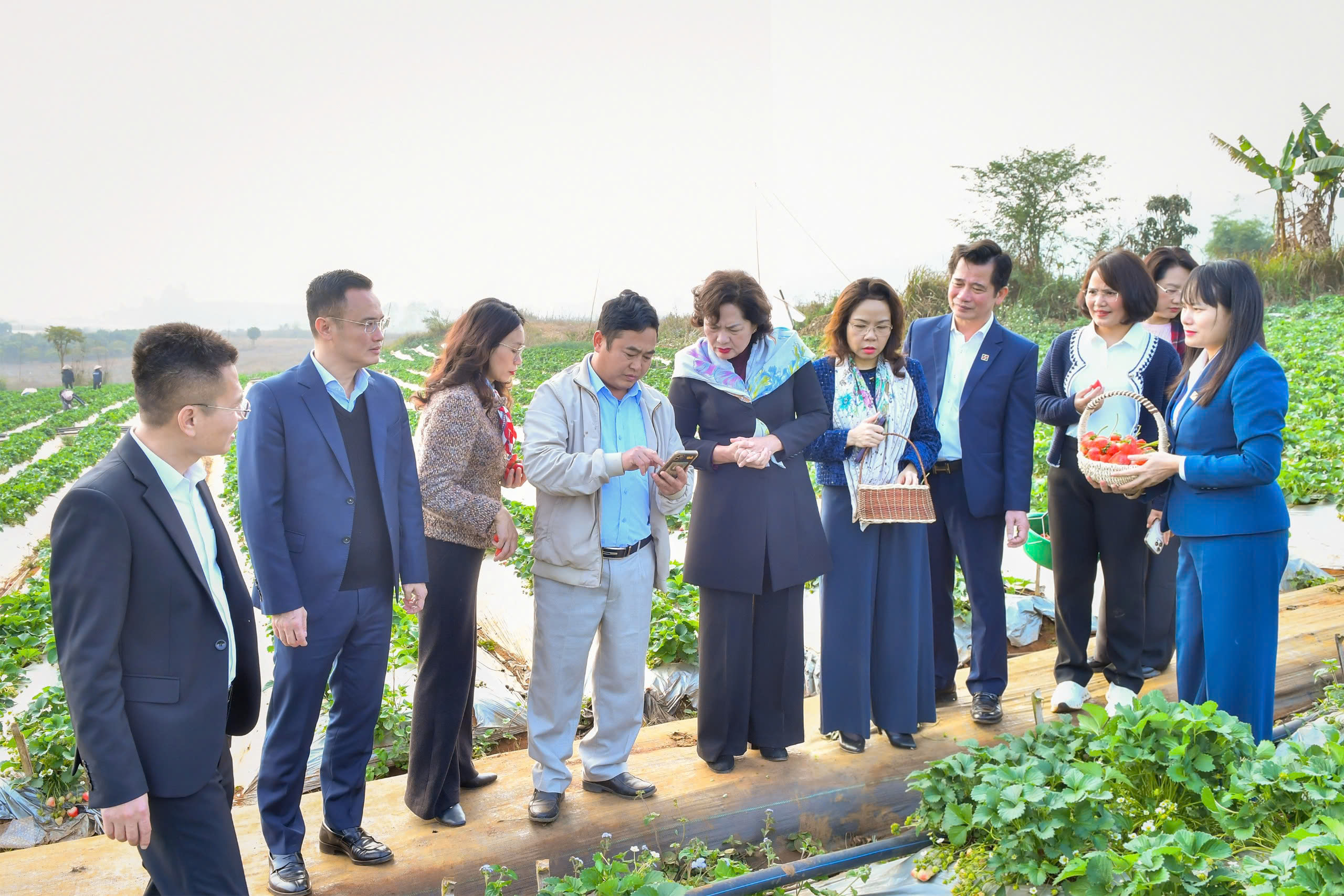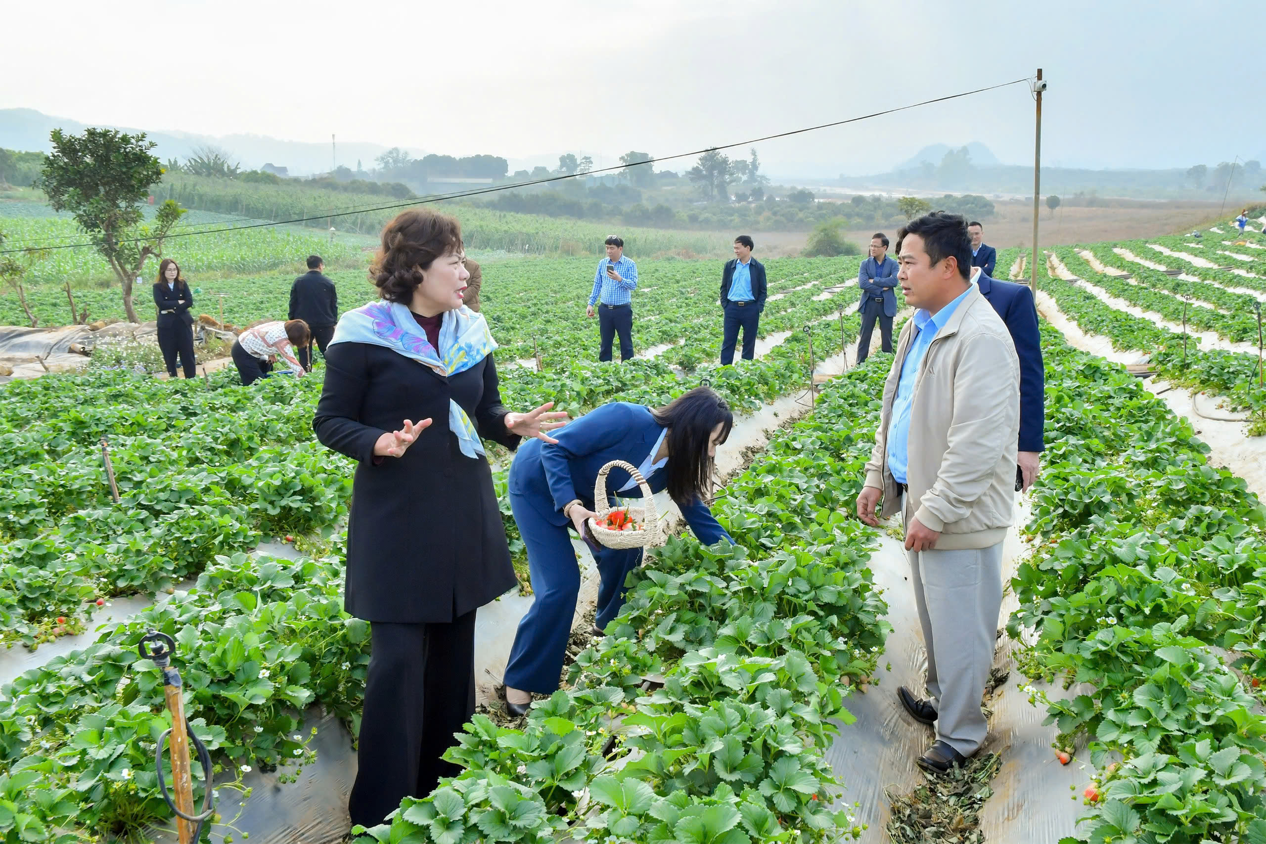 Thống đốc Nguyễn Thị Hồng trao đổi với ông Nguyễn Văn Nam - đại diện Hợp tác xã Dâu tây Xuân Quế (xã Mai Sơn, tỉnh Sơn La) - một trong những mô hình nông nghiệp sạch hoạt động hiệu quả nhờ nguồn vốn tín dụng ngân hàng