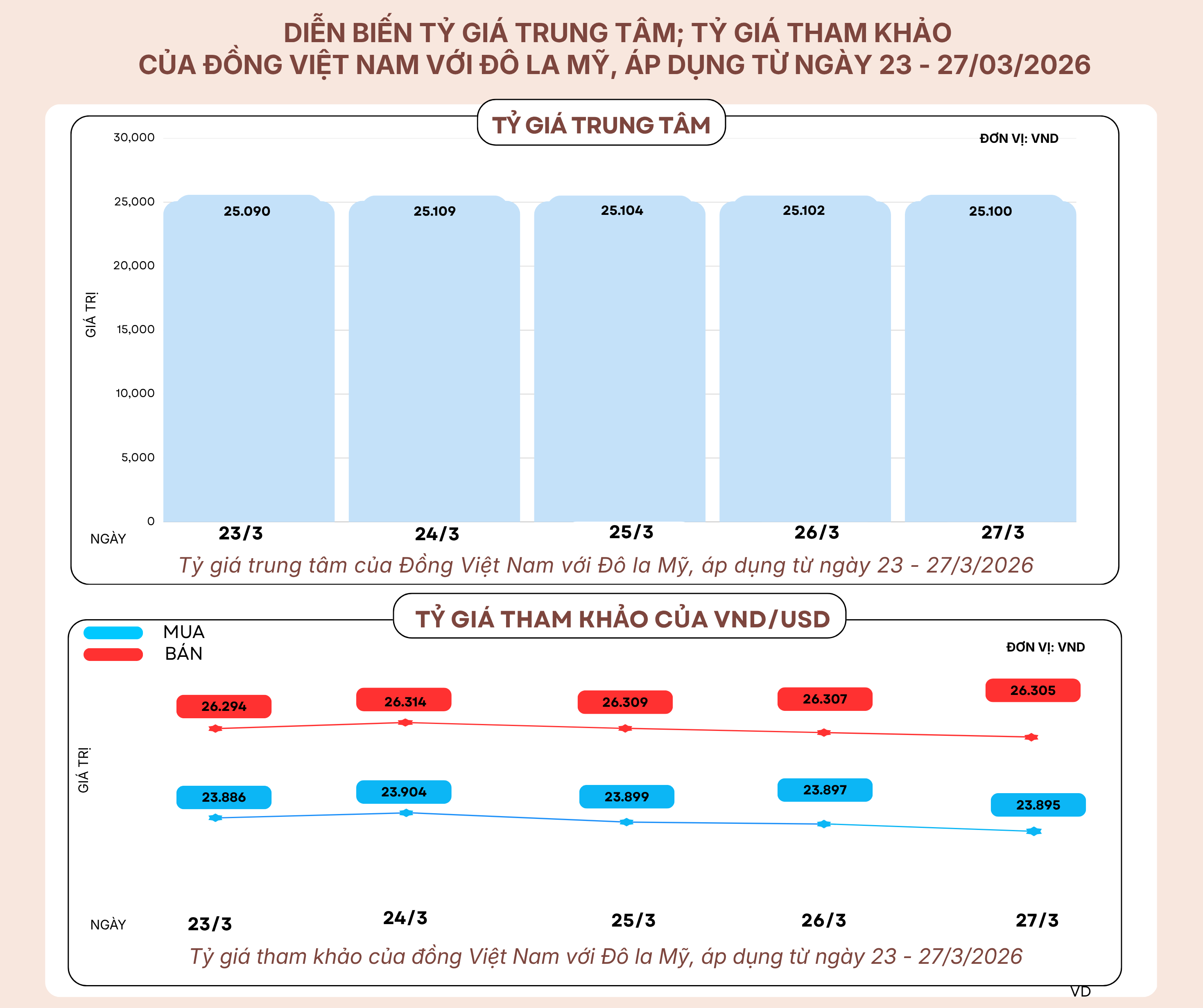 Diễn biến tỷ giá trung tâm, tỷ giá tham khảo của đồng Việt Nam với Đô La Mỹ, áp dụng từ ngày 23 - 27/3/2026 27/03/2026