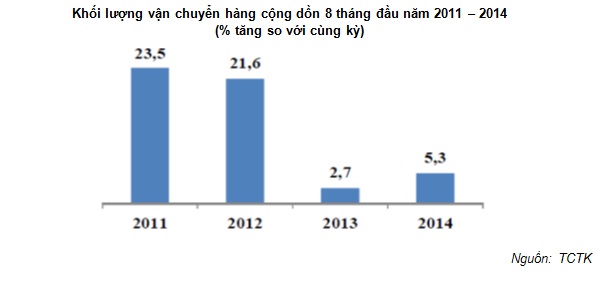 Trước hết, xét về khía cạnh tiêu dùng, tiêu dùng tư nhân mặc dù đã có sự cải thiện nhưng mức tăng vẫn còn thấp. Tổng mức bán lẻ hàng hóa và doanh thu dịch vụ tiêu dùng mặc dù luôn tăng cao hơn cùng kỳ năm 2013 nhưng mức cải thiện không lớn và còn thấp hơn nhiều so với mức tăng trên 10% của giai đoạn 2010 – 2011. Bên cạnh đó, tốc độ tăng trưởng khối lượng vận chuyển hàng hóa trong 8 tháng đầu năm 2014 mặc dù tăng so với cùng kỳ năm 2013 (từ 2,7% lên 5,3%) nhưng vẫn chỉ bằng ¼ so với các năm 2011 và 2012.