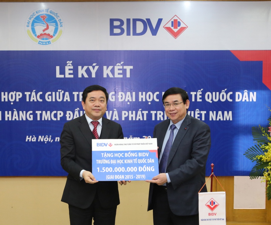 Ngày 11/2/2015, tại Hà Nội, Ngân hàng TMCP Đầu tư và Phát triển Việt Nam (BIDV) và Trường Đại học Kinh tế Quốc dân (ĐHKTQD) đã ký kết Thỏa thuận hợp tác toàn diện giai đoạn 2015-2019 nhằm triển khai các nhiệm vụ đào tạo, nghiên cứu khoa học, phát triển công nghệ và cung cấp dịch vụ ngân hàng. Cũng tại Lễ ký kết, BIDV đã trao gói Học bổng trị giá 1,5 tỷ đồng trong vòng 5 năm (từ 2015 đến 2019) cho các sinh viên xuất sắc của ĐHKTQD.