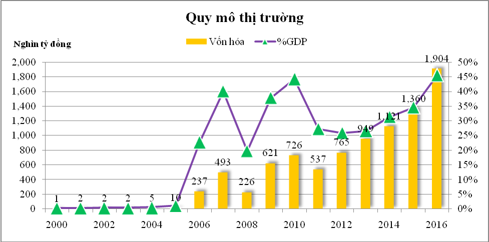 Tương tự, giá trị vốn hóa cũng tăng mạnh. Nếu như năm 2000, vốn hóa thị trường đạt 986 tỷ đồng, chiếm 0,28% GDP, năm 2015 đạt hơn 1.325.000 tỷ đồng, tương đương hơn 34% GDP. Đến cuối năm 2016, vốn hóa thị trường cổ phiếu tăng hơn 1.500 lần so với năm 2000, đạt gần 1.904 tỷ đồng; Giá trị dư nợ trái phiếu hiện chiếm khoảng 24% GDP, mức vốn hóa thị trường cổ phiếu đạt trên 43,2% GDP. Tính chung cả cổ phiếu và trái phiếu quy mô TTCK chiếm khoảng 69% GDP. Giá trị giao dịch bình quân toàn thị trường năm 2016 đạt gần 6.890 tỷ đồng/phiên, tăng 40% so với bình quân phiên năm 2015 và gấp 4.900 lần so với năm 2000. (Hình 1)