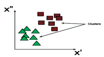 Mặt khác, các kỹ thuật phân cụm rất phổ biến bất cứ khi nào biến đích hoặc biến đáp ứng không quan trọng hoặc không có sẵn. Như tên gọi đã gợi ý, các kỹ thuật phân cụm có khả năng phân cụm dữ liệu đầu vào theo mức độ giống nhau. [Hình 6] cho thấy một ví dụ trong đó dữ liệu đầu vào đã được chia thành hai cụm. Trong khi dữ liệu trong cụm đầu tiên được mô tả bằng cách sử dụng các hình tam giác màu xanh lá cây, thì dữ liệu trong cụm thứ hai được mô tả bằng cách sử dụng các hình vuông màu đỏ.