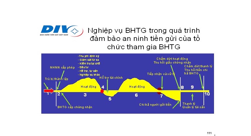 Quyền lợi của người gửi tiền tại các ngân hàng được bảo đảm thông qua các hoạt động của tổ chức BHTG và gắn với vòng đời của ngân hàng từ khi thành lập – hoạt động – chấm dứt hoạt động. Cụ thể, khi thành lập ngân hàng, tổ chức BHTG tham gia thẩm định điều kiện được cấp phép hoạt động; trong quá trình ngân hàng hoạt động, tổ chức BHTG thực hiện kiểm tra, giám sát thường xuyên, phổ cập cách thức bảo vệ tiền gửi, tham gia xử lý khó khăn ngân hàng, và cuối cùng là chi trả tiền gửi được bảo hiểm khi ngân hàng chấm dứt hoạt động (tham chiếu sơ đồ).