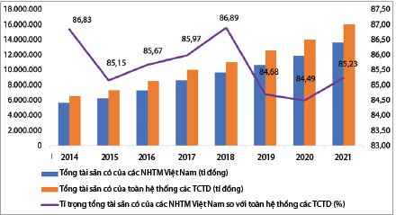 Hình 1: Tỉ trọng tổng tài sản có của các NHTM Việt Nam so với toàn hệ thống các TCTD giai đoạn 2014 - 2021