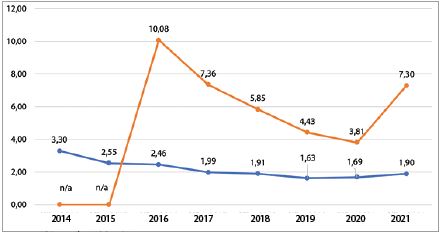 Hình 2: Tỉ lệ nợ xấu của toàn hệ thống các TCTD Việt Nam giai đoạn 2014 - 2021