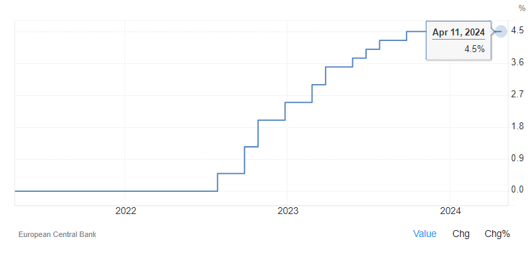 Ngày 11/04/2024, Ngân hàng Trung ương Châu Âu (ECB) đã quyết định duy trì lãi suất ở mức cao kỷ lục lần thứ năm liên tiếp trong cuộc họp chính sách tháng 4, với lãi suất hoạt động tái cấp vốn chính duy trì ở mức 4,5% (mức cao nhất trong 22 năm) và lãi suất cơ sở tiền gửi ở mức 4% (mức cao nhất từ trước đến nay), quyết định của ECB phù hợp với kỳ vọng của thị trường. Lãi suất tiền gửi bình quân của khu vực đồng Euro ở mức 1,27% trong giai đoạn 1999-2024, đạt mức cao nhất 4% vào tháng 9/2023, mức thấp nhất -0,5% vào 9/2019.