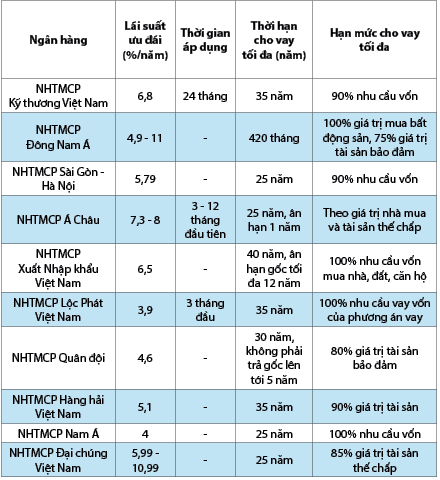 Chính sách cho vay mua nhà của các ngân hàng khá đa dạng, điểm chung là thời gian cho vay dài và hạn mức cho vay tối đa tương đối cao. Mức lãi suất ưu đãi đa dạng, dao động từ 3,9% đến 11% mỗi năm. Một số ngân hàng như NHTMCP Kỹ thương Việt Nam và NHTMCP Á Châu áp dụng lãi suất ưu đãi trong một khoảng thời gian cụ thể, từ 3 đến 24 tháng, trong khi các ngân hàng khác không giới hạn thời gian. Thời hạn cho vay tối đa dao động từ 25 đến 40 năm, với NHTMCP Đông Nam Á cung cấp thời hạn dài nhất lên đến 35 năm. Hạn mức cho vay thường đạt từ 75% đến 100% giá trị tài sản hoặc nhu cầu vốn, tùy thuộc vào từng ngân hàng. (Bảng 1)