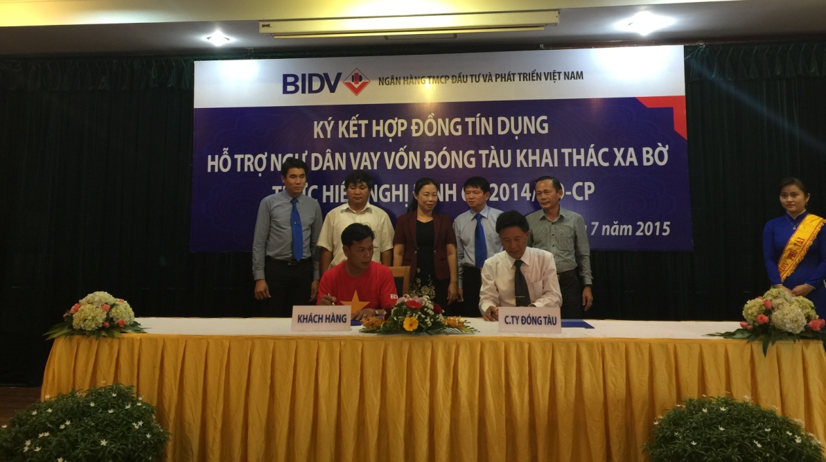 Tại buổi ký kết, Chi nhánh BIDV Phú Tài đã ký kết 07 hợp đồng tín dụng với ngư dân tại các huyện Phù Mỹ, Phù Cát và Hoài Nhơn, tỉnh Bình Định để đóng mới tàu vỏ thép với tổng số tiền cho vay 107 tỷ đồng. Trước đó, các Chi nhánh BIDV trên địa bàn tỉnh Bình Định đã ký kết và cho những ngư dân đầu tiên vay vốn để đóng tàu vỏ thép. Hiện tại, con tàu đã được hạ thuỷ, đang trong giai đoạn hoàn thiện và dự kiến sẽ vươn khơi trong tháng 9/2015.